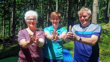 Sie lädt mich zum schnuppern in ihre Waldbaden-Gruppe ein - und bringt mich zum absoluten Entspannen. Wir liegen auf einer Matte, schauen zu den Baumwipfeln auf in den Himmel, atmen langsam und tief ein und aus. Die nächste Übung wird ein kleiner Nervenkitzel: Michaela bindet ein Seil zwischen zwei Bäume und lädt uns ein, die Schuhe auszuziehen und die Augen zu schließen. So geleitet sie uns barfuß durch ein kleines Stück Wald. Sehr spannend, den Wald nur über die Nase, die Geräusche und die Fußsohlen wahrzunehmen.