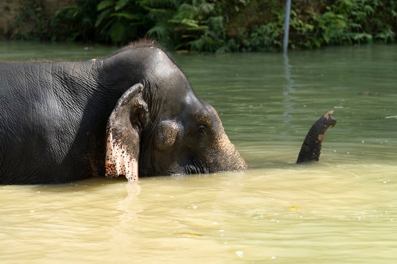 Ich lerne: So ein Rüsseltier hat's praktisch. Braucht nie ein Schnorchel und kann ziemlich lang unter Wasser bleiben. Die Elefantendamen nützen den Rüssel sehr geschickt zum Atmen. Und wollen gar nicht raus, aber jetzt führen sie ihre Mahuts zur „Waschstraße der Elefanten."