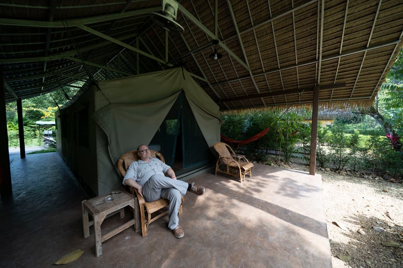 Wenige Tage später fahre ich im Elephant Hills Camp vor - und werde gleich von den netten Mitarbeitern begrüßt. Ich beziehe mein Zelt. Wobei: Zelt ist eine starke Untertreibung. Eher: Feines Hotelzimmer mit richtig angenehmen Betten, elektrischem Strom, Dusche und WC, nur dass halt zufällig keine Mauern drum herum gebaut ist, sondern Zeltstoff sanft im Wind flattert. aber drüber noch ein gebautes Dach. Sicherheitshalber, dass es ja nicht durchregnet.