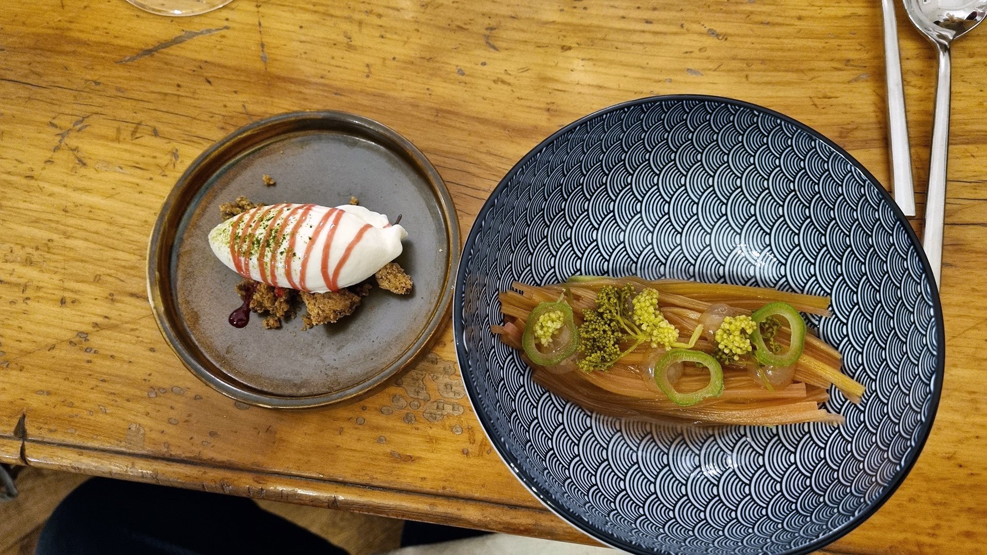 Ich darf etwa Gebeizte Lachsforelle mit Radieschen, Spinat und Creme fraiche genießen, oder - eine schräge schwarze kuriose Delikatesse - Kohle-Airbread mit Gänseleber. Maibock mit geschmorter Sellerie und Maiwipferl ist die geniale Kombination aus typisch regionaler Hauptspeise und fraffiniertem Aha-Erlebnis. Und das Dessert liest sich so außergewöhnlich wie es geschmeckt hat: Grüntee-Mousse mit hausgemachtem Joghurt, Rhabarber und Holunderknospen.